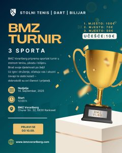 BMZ Vorarlberg vas srdačno poziva na veliki sportski turnir u stolnom tenisu, pikadu i bilijaru. Izaberite svoju omiljenu disciplinu i pokažite svoje vještine!